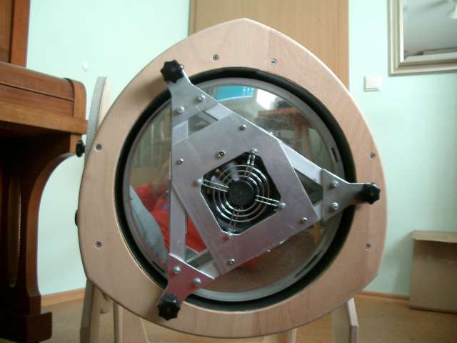 Van:First experience shows, that (at least in winter time) it is not enough to place the mirror box 1hour before observation before the door. Looking at defocussed star you still can see strong wafting, images will be worsen. When the mirror reaches eliquilibrium, the images are much better, but this can last an other two hours. To increase the cooling down I mountend a 9cm (3 1/2 inch) PC van at the bottom, using 2mm (0.08 inch) aluminium. The connection to the power station is via a chinch socket. For the mounting 4 tapping screws were used. |
