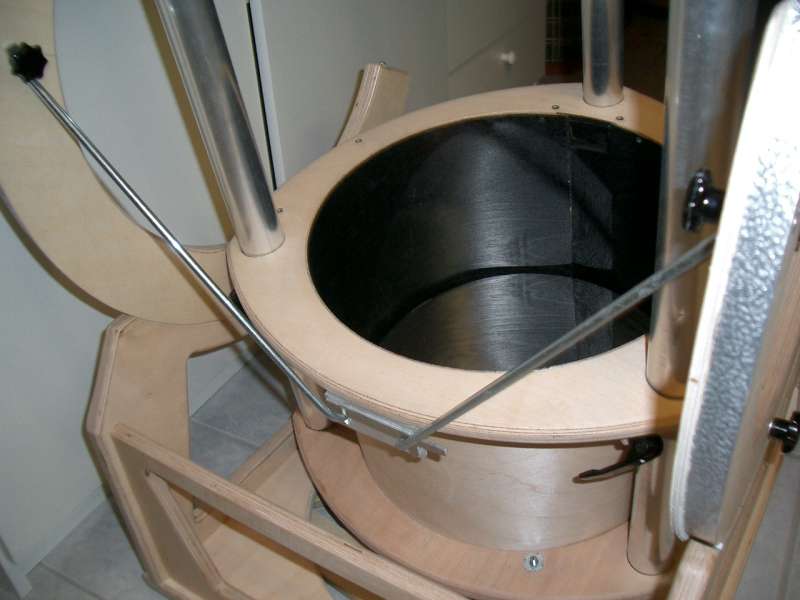 The primary mirror is made by myself. When in August, 2002 my 14 mirror broke on the tiles due to weak rack mounting (see picture) it was not possible to get a new blank by return. Therefore I decided to buy an available 315mm blank to eliminate frustrations. After 5 weeks I set it aside (I got some scratches while polishing and had to go back to fine grinding), at this time the successor blank for the 14 project arrives me, it had priority to be finished. At Dec., 26th I continued with the 315mm blank. Two weeks later the mirror was figured, experiences I made with the second 14 helped a lot.