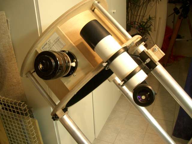 Finder mount: I love my mechanical fret saw! With some experience it is possible to make relatively difficult parts. Two pieces of 0.72 (18mm) plywood a carrying the finder shoe. Just attaching it on the pieces I is fixed. The clamping will be done with one M6-star handle; it will be substituted by no question a quick release skewer.