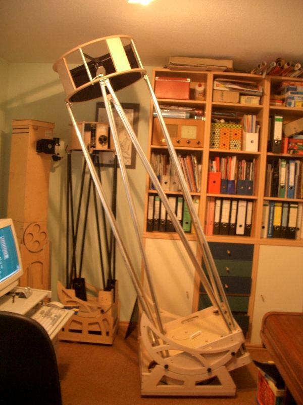Primary mirror cell: made of 25mm*25mm (1 * 1 ) square aluminium pipe, 2mm (0,02 ) thick. Lateraly struts made of 5mm*25mm aluminium. It's a classical 18- point flotation cell like described in David Kriege's book, but completely made of aluminium. I ve sawed and drilled the struts and fixed in a jig for welding done by a small company.