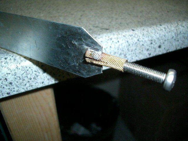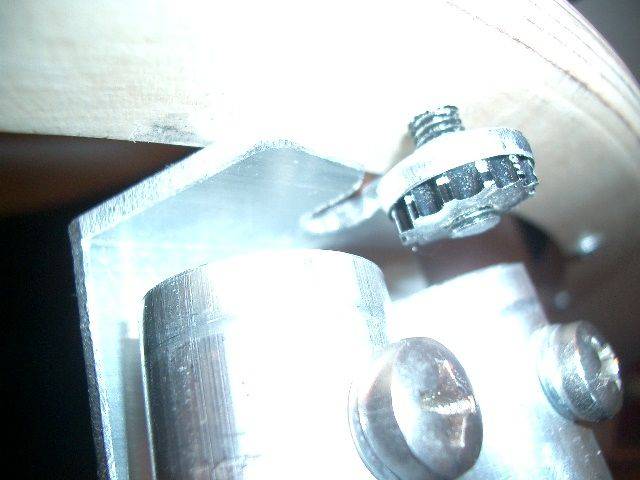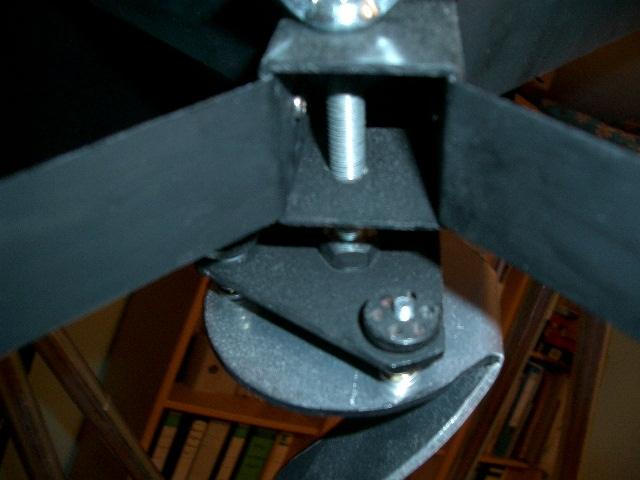 All sawing was made with a simple and cheap mechanical fret saw, using a thin saw blade this is possible If you have enough endurance. In difference to Kriege I took a thin metal sheet as sling. Left and right beside the mirror 8mm+20mm (0,3 * 0,8 ) aluminum pieces were welded at the middle strut. Through 5mm (0,2 ) bore hole the ends of the metal sling will be put. The ends are soldered screw threat pieces. To avoid mirror warping at the inner side of the sling adhesive tape is affixed.