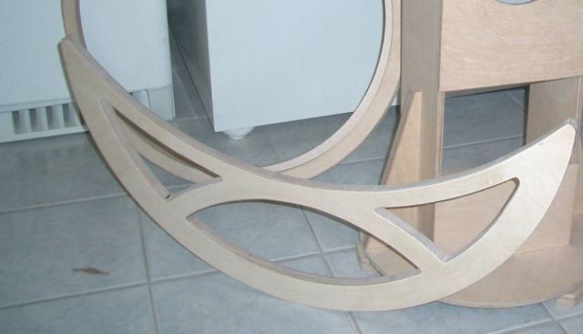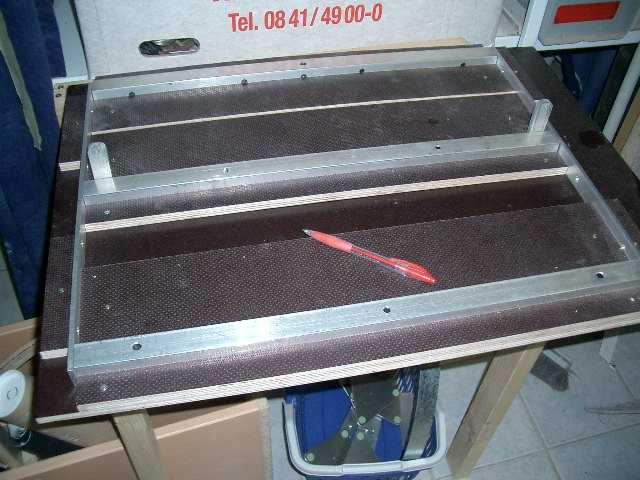 The rocker is built as flat as possible. The groundboard is 24mm (1 ) thick, left and right 21mm (0,8 ), front and rear 12mm (0,5 ). To save weight and for nice looking purposes I cut out some pieces. I took glassboard for the azimuth bearings, fortunately there is a small specialised company in my village. It took me 10 Euro to get a cut piece in the needed dimension.