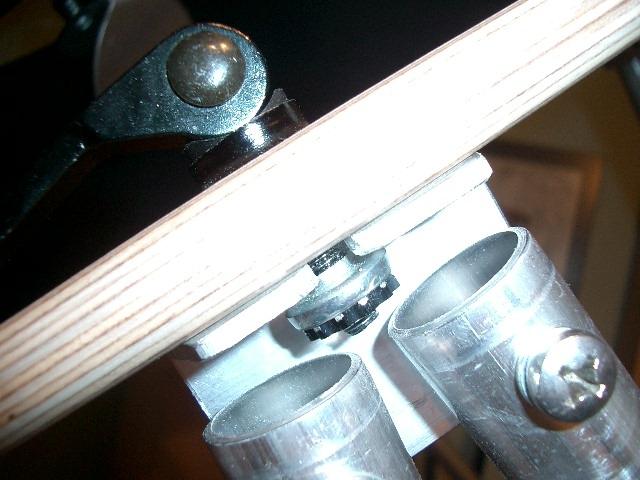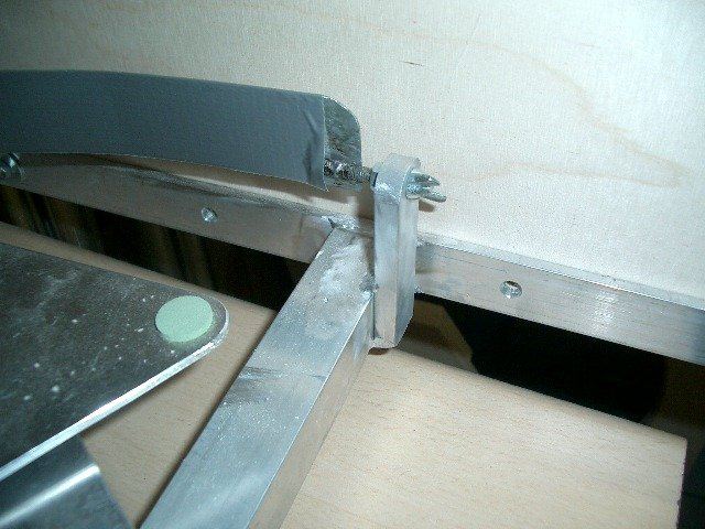 How to connect the secondary cage with the truss poles: finally I took the following solution: I connected trusses by pairs at the upper side. With M6 (0,24 ) screws with self-clamming bolts are these connected with aluminium brackets, 3mm (0,12 ) thick. I ve sawn them with the mechanical fret saw from a bar. A Key-Hole houses the quick release skewer bolt. It looks like it will work very well.