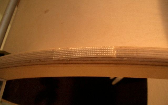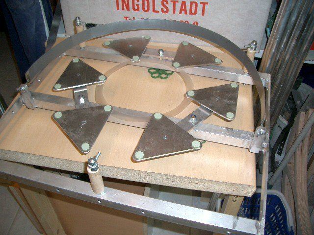Altitude Bearings: Similar to the ones of PHOENIX, my 14 Telescope. This time I tool a cheap router to achieve accurate radii. The diameter of the bearings is 700mm (27,6 ), 21mm (0,8 ) thick made of Baltic birch plywood. The slide is made of 1mm (0,04 ) aluminum. I could get this at a maximum length of 1 meter (40 ) only. After some doubts I decided to add a piece. Using a good adhesive and some clamps it came to a good end.