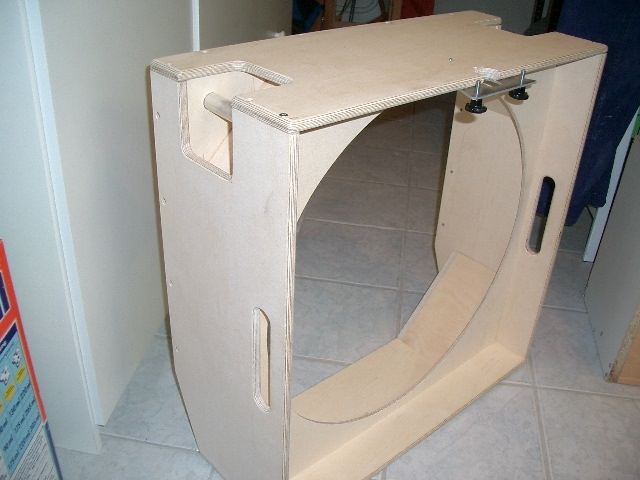 The mirror box is made of 12mm (0,5 ) plywood. Placing triangular reinforcement braces into the corners increases stability. For transportation purposes I built in carrying handles, as seen at Stathis nice 24 Kyklopas telescope. As the mirror box weights only 53 lb, I think I will not use these handles, but for sure is for sure!