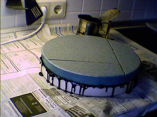 Mit Pappe einen ca. 5cm breiter Streifen fertigen, den um eine der auf einem Brett liegenden Fließen wickeln und zusammenkleben. Dann wird die "Füllung" angemacht. Bei mir kommt einfacher Fliesenkleber zum Einsatz, der 25kg-Sack (es gibt auch kleinere Gebinde) für 6 Euro, wer will kann auch Flexkleber verwenden (ab 16 Euro der Sack), mit dem Einfachem ging es bei mir aber auch. Circa 2 bis 3 cm Füllung rein, ebenstreichen und trocknen lassen. Das untergelegte Brett hat den Vorteil, dass man das ganze z.B. so noch in den Heizungsraum tragen kann. Gut durchtrocknen lassen (im Sommer in die pralle Sonne stellen) , dann nochmals eine dünne Kleberschicht auftragen und die 2. Scheibe aufkleben. Feinsteinzeug zieht kein Wasser, die Feuchtigkeit kann nun nur noch am Rand entweichen. Nochmals trocknen (1 Tag in Wärme reicht) , dann ist die Scheibe im Rohzustand fertig.