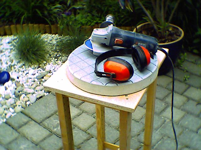 Ich verwende Feinsteinzeugfließen aus dem Baumarkt in einer Stärke von ca. 8 mm. Die gibt es im Angebot häufiger für unter 10Euro per Quadratmeter. Bis 30cm Tooldurchmesser braucht man nun je eine pro Seite; mit Glück bekommt man die auch als kostenlose Muster. Ist der Rohling schon vorhanden, kann man den gut zum Anzeichnen verwenden, ansonsten mit einem Zirkel den Kreis aufzeichnen, mit fetten Stift deutlich machen, dann ausflexen. Ich verwende eine kleine Einhandflex mit unsegmentierter Diamantscheibe (Flex für 25 Euro, 2 Scheiben für 5 Euro). Mit etwas Übung ist ein Kreis in 10min herausgearbeitet.